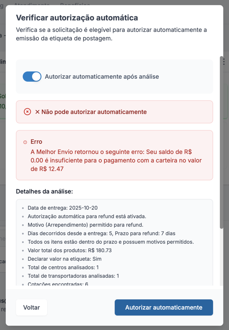 Em algumas transportadoras, como Melhor Envio e Loggi, é necessário ter **saldo em conta** para aprovar a emissão das etiquetas.
