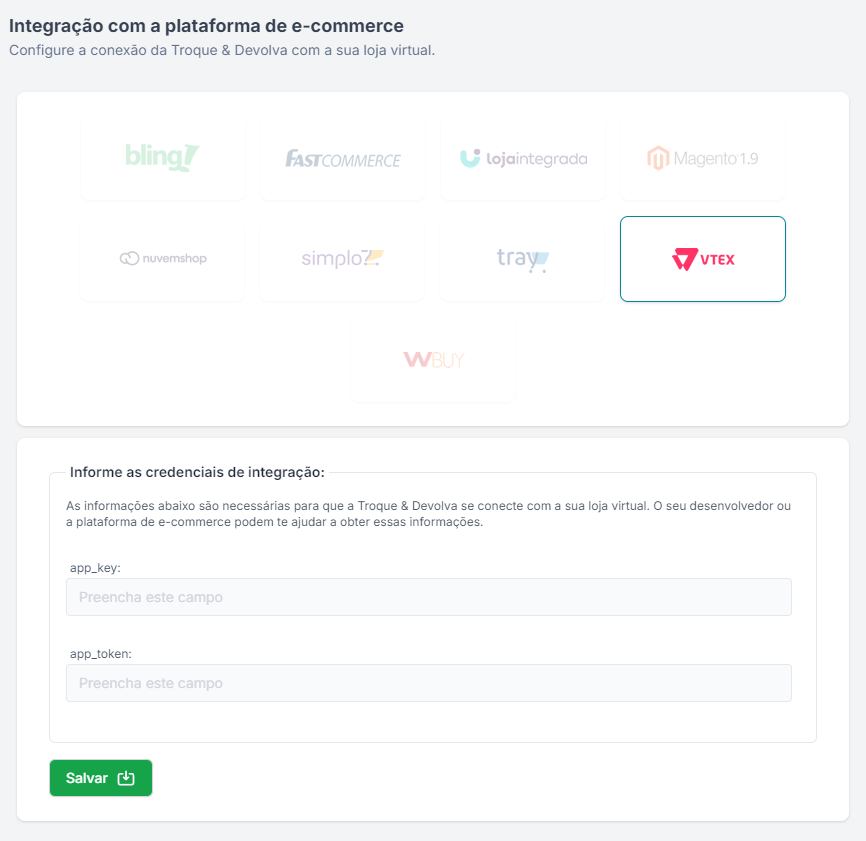 <figure><img src="https://969079999-files.gitbook.io/~/files/v0/b/gitbook-x-prod.appspot.com/o/spaces%2FkEpLXLA4H1OOb2Z6lSAF%2Fuploads%2Fyu7WicQjUyWHymjQDU9p%2Fimage.png?alt=media&#x26;token=d7d215e0-7b3a-4fbe-9938-2e9b3be5d20b" alt="" width="375"><figcaption><p>Tela de configuração de integração na Troque &#x26; Devolva</p></figcaption></figure>
